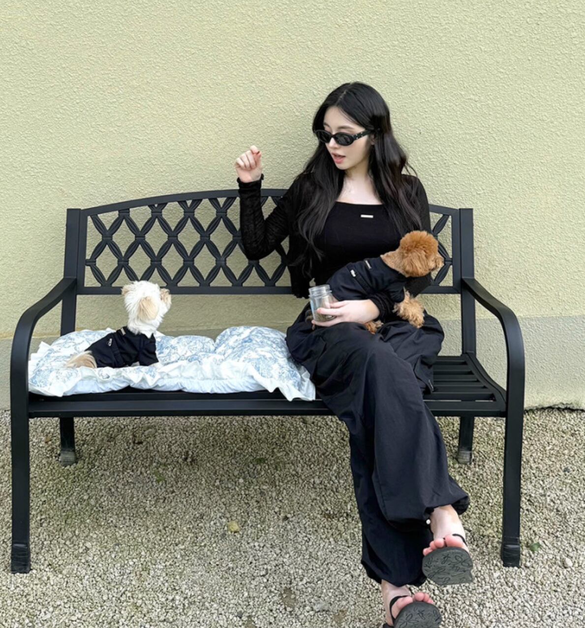 飼い主はカーディガン+ノースリーブセットにワイドパンツを、