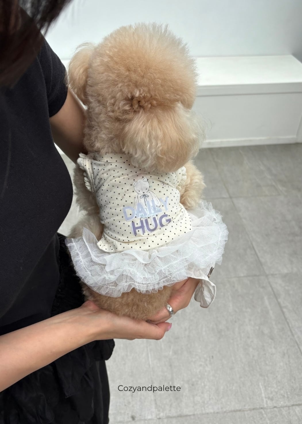 【Huggy Bear】:クリームドットの上に描かれた「Daily Hug」レタリングとくまのイラスト