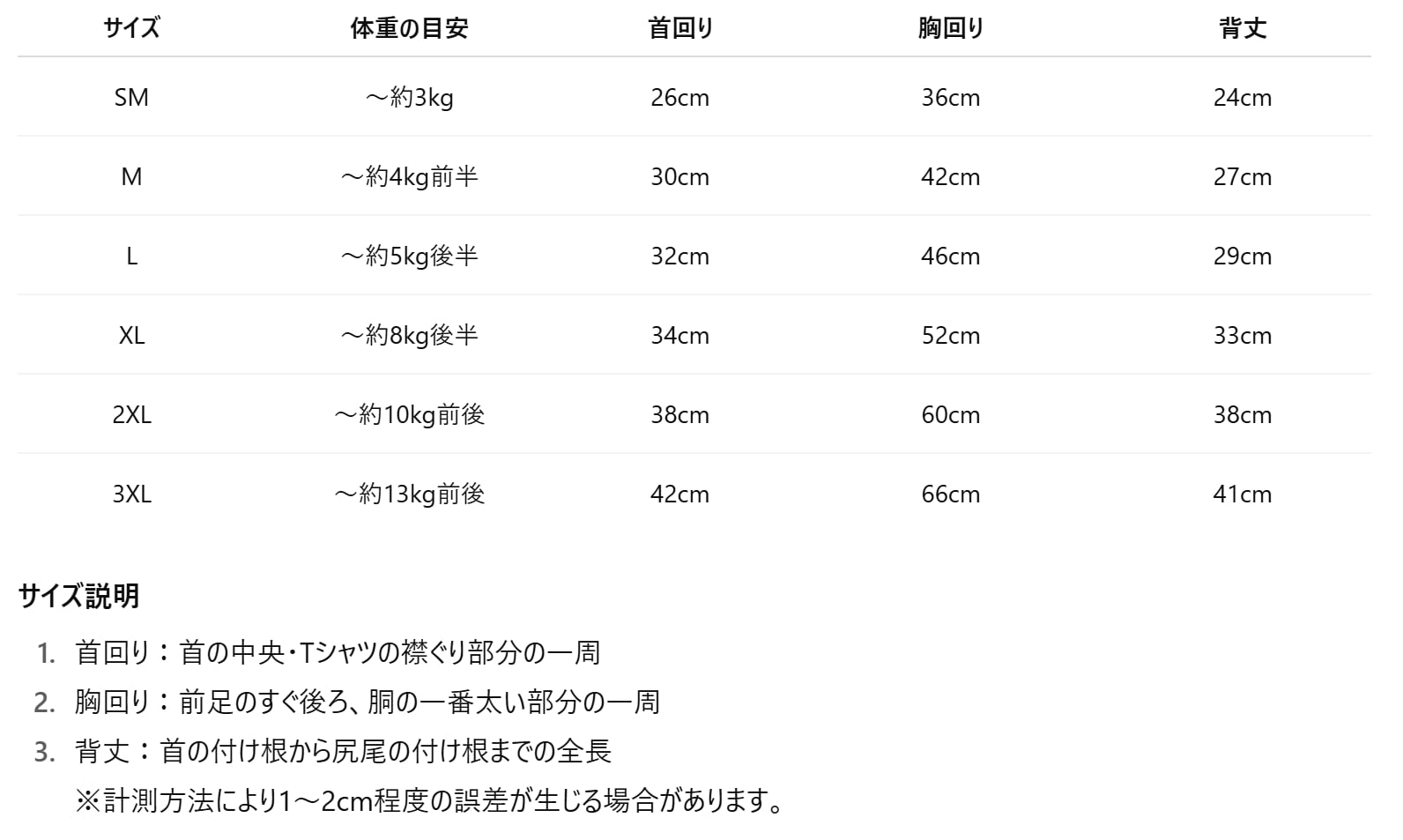 本サイズ表は平均体重を基準に作成しており、犬種・体型により多少の誤差があります。