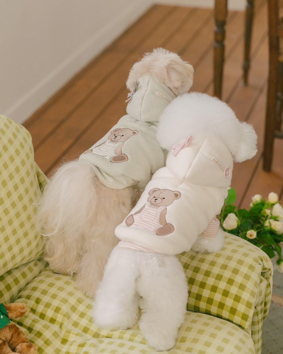 ふわふわのニットの上にキルティングを重ねた、ブラウニーカラーのくまさん刺繍が特徴の