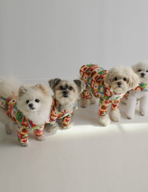 コッテアコッテ(꼬떼아꼬떼)の代表的な冬アイテム「ポンプセット」は、ペット用のジャンパー・パジャマスタイルのオールインワン・ペット用ルームパンツがセットになった商品です。
