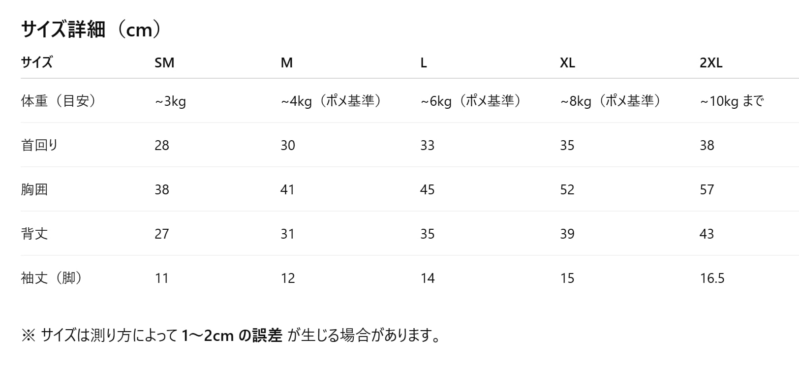 本サイズ表は平均体重を基準に作成しており、犬種・体型により多少の誤差があります。