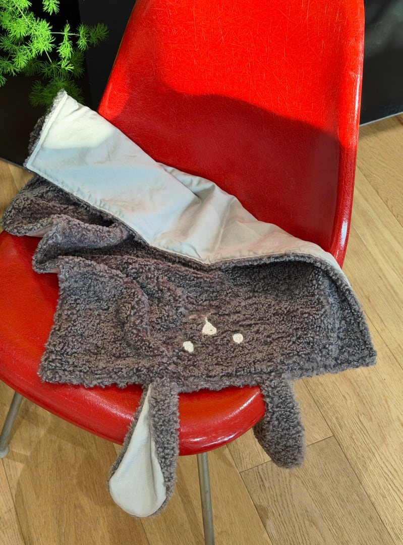 柔らかいファー素材の上に、シルバーのうさぎの顔、きらきらとした可愛いヒゲ、そして大きな耳がポイントのブランケットです。