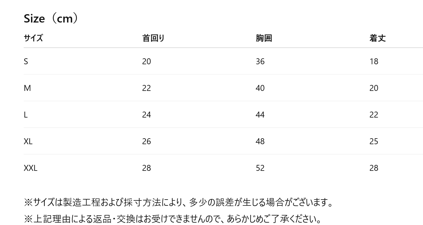 首回り:24cm/胸囲:34cm/着丈:25cm