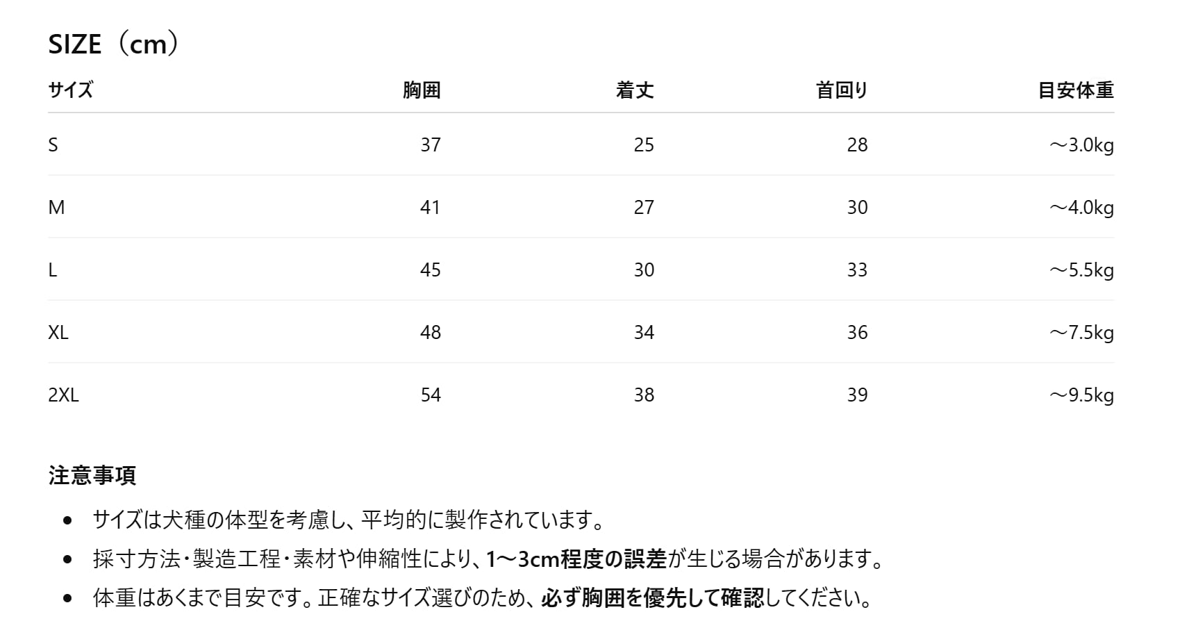 サイズ表の胸囲は、生地の厚みを除いたサイズです。