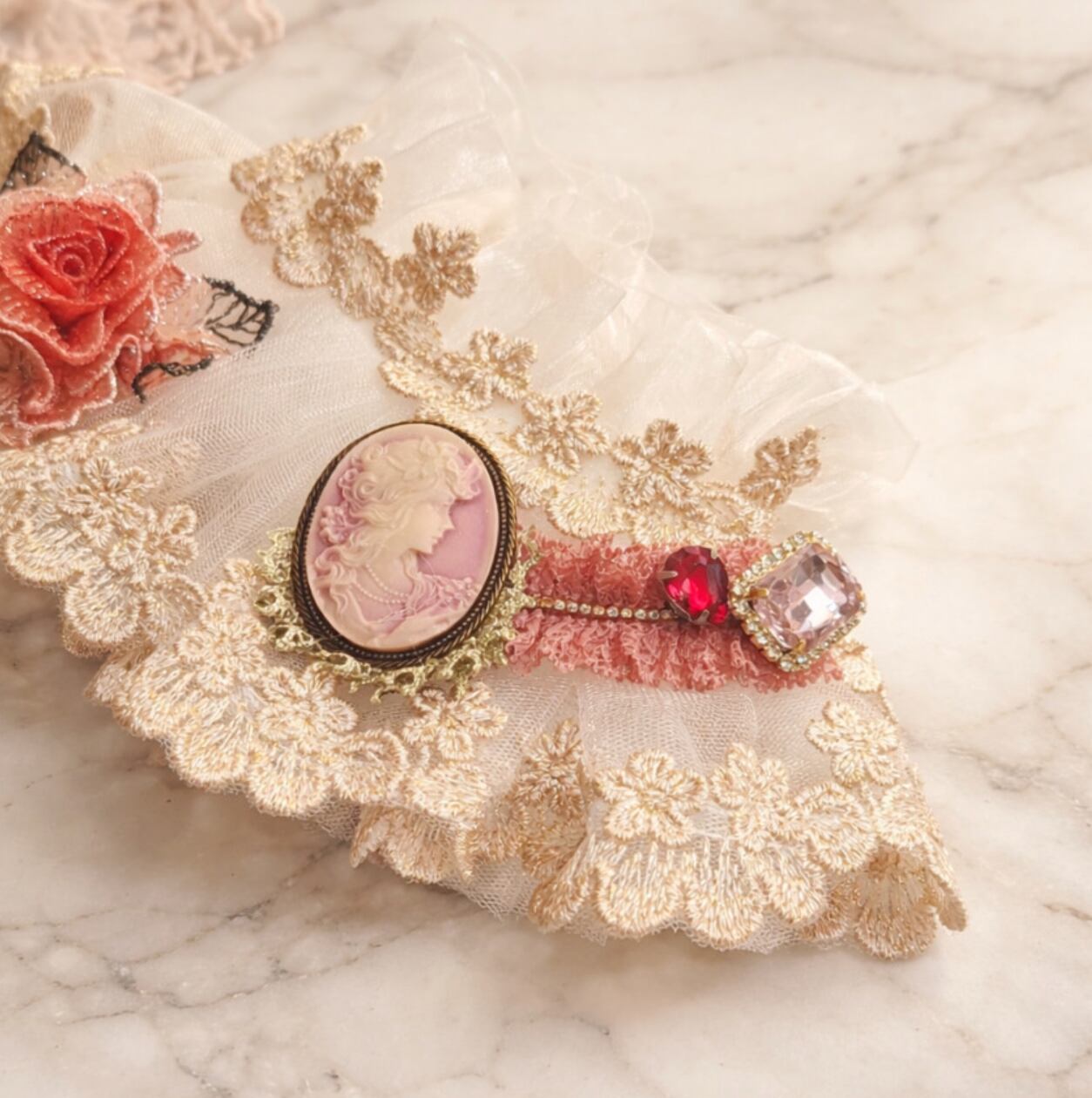 ヴィンテージ調のカメオブローチをアクセントとして配置。
