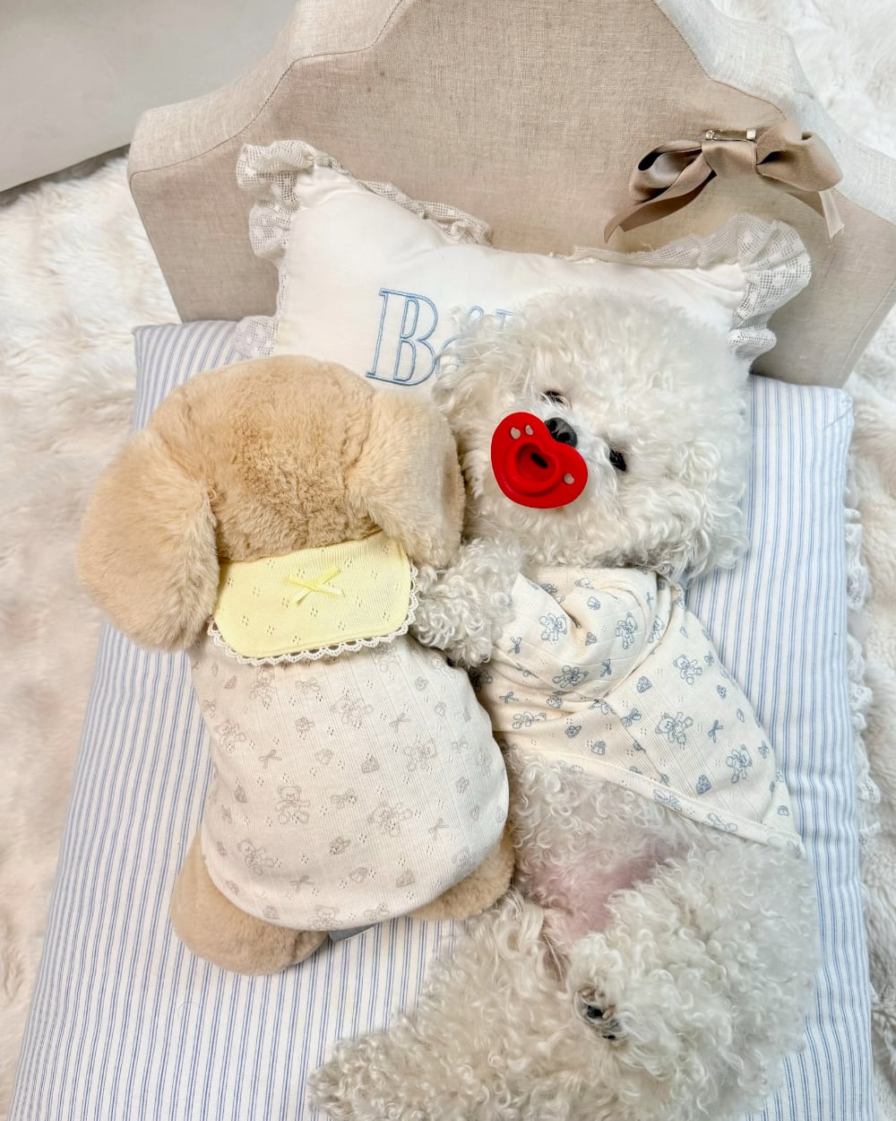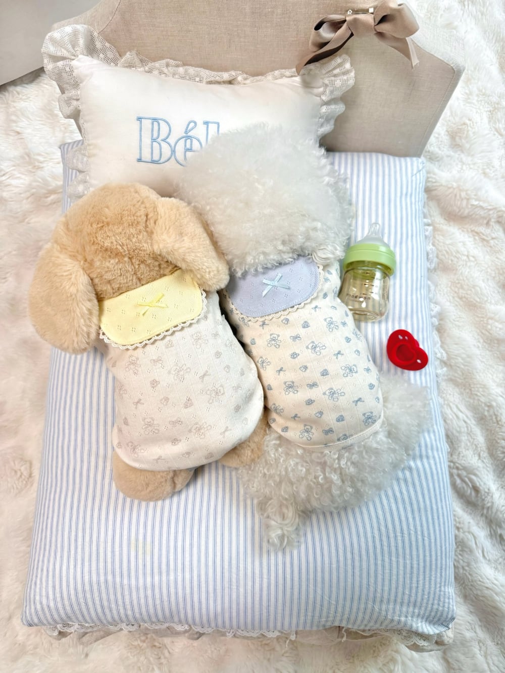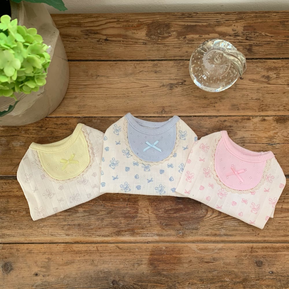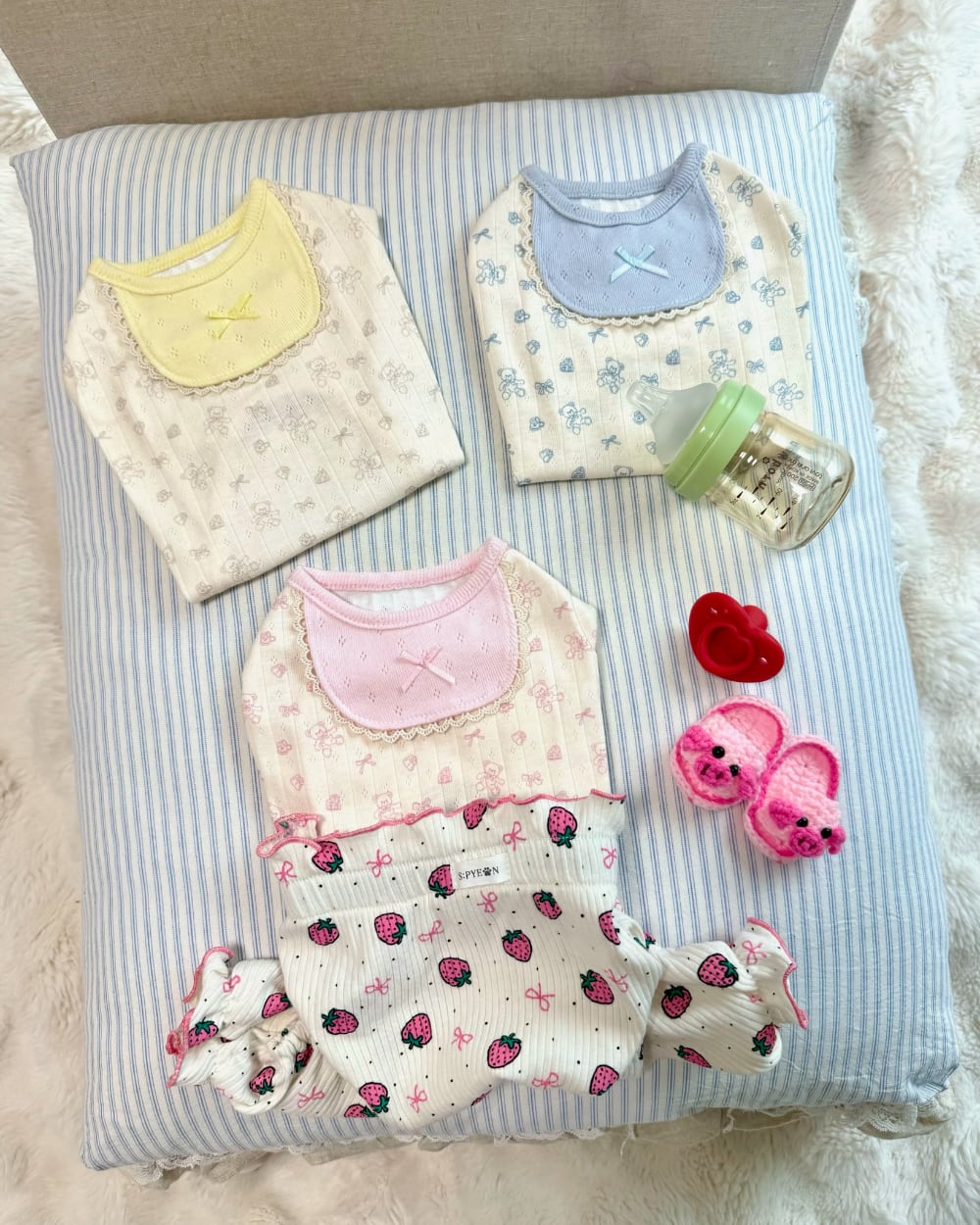 パステルカラーのスタイ(よだれかけ)ディテールがポイントとなり、
