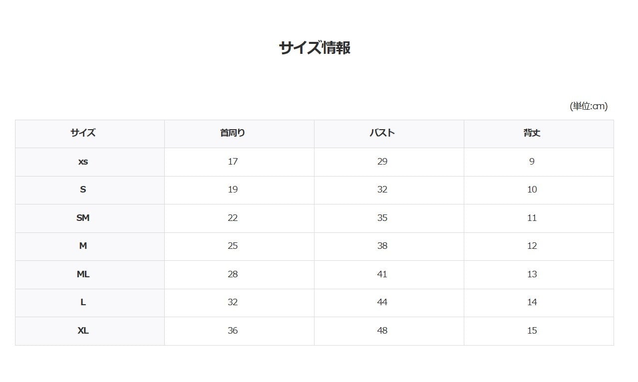 「首周り/胸囲/丈/体重/着用サイズ」の順で記載しております。