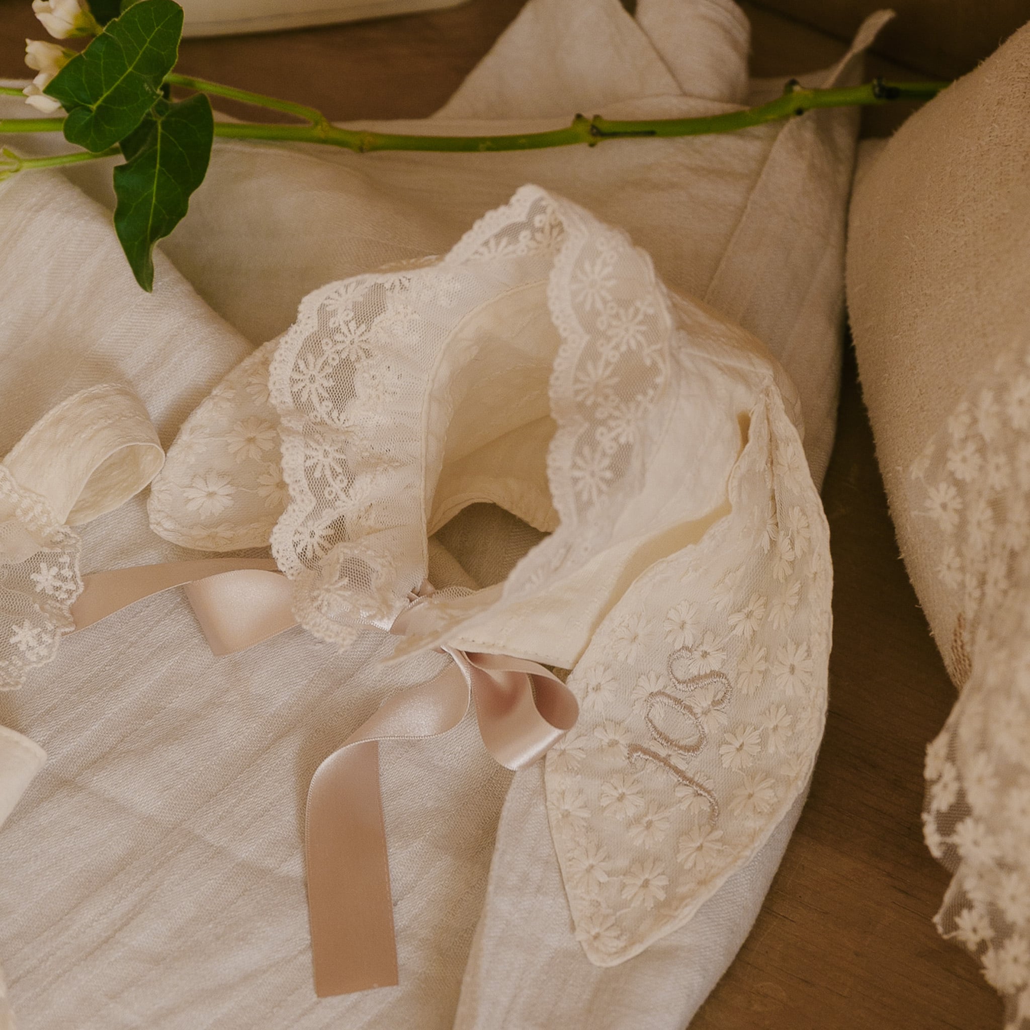 繊細なデイジーの花刺繍が施されたレース生地を合わせ、