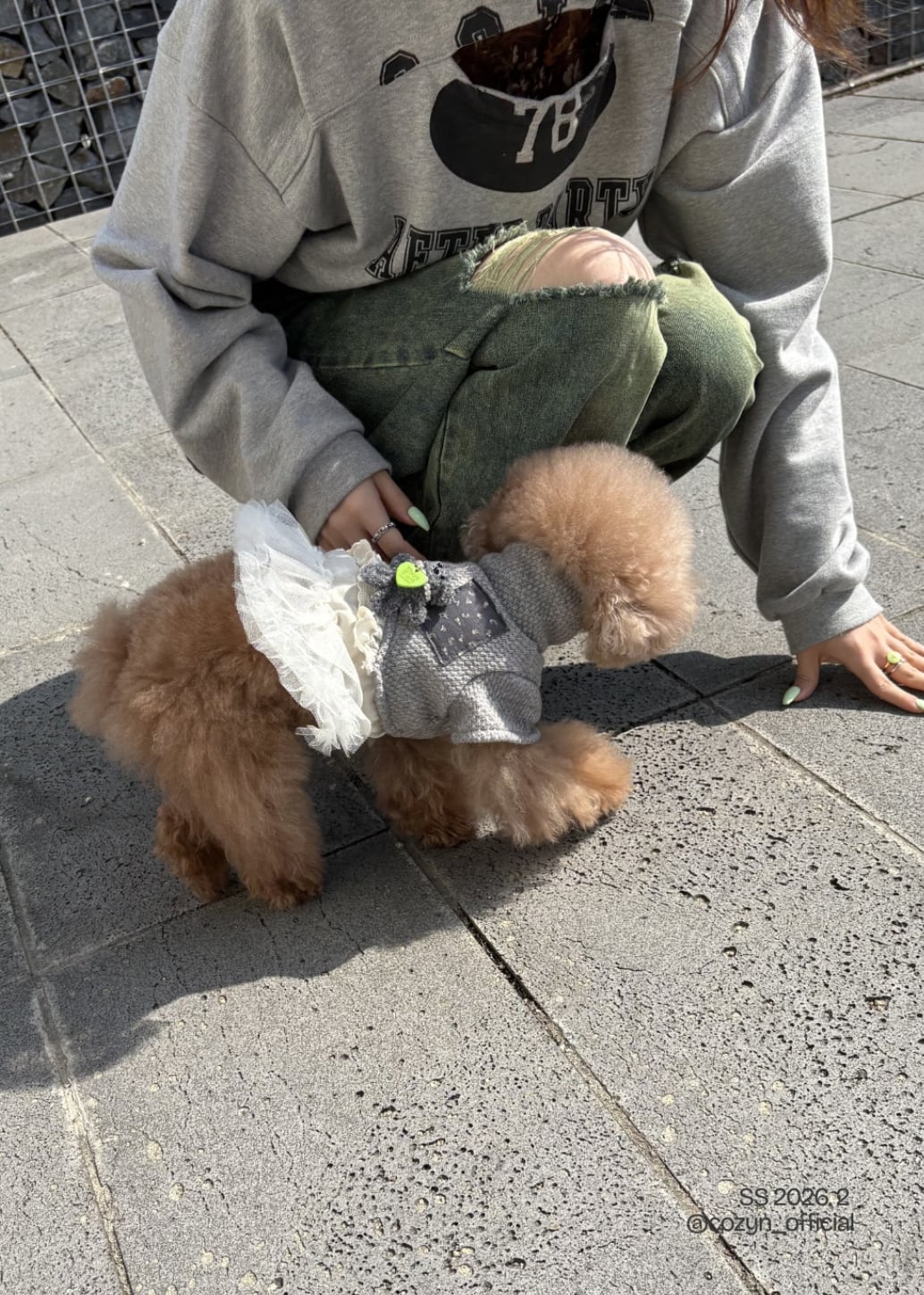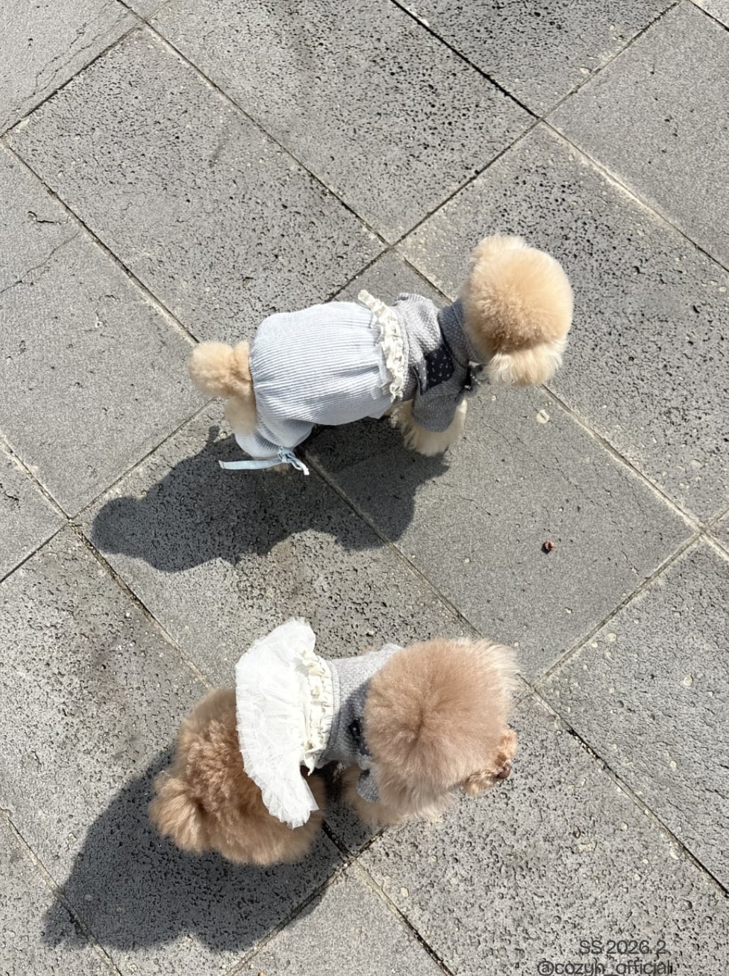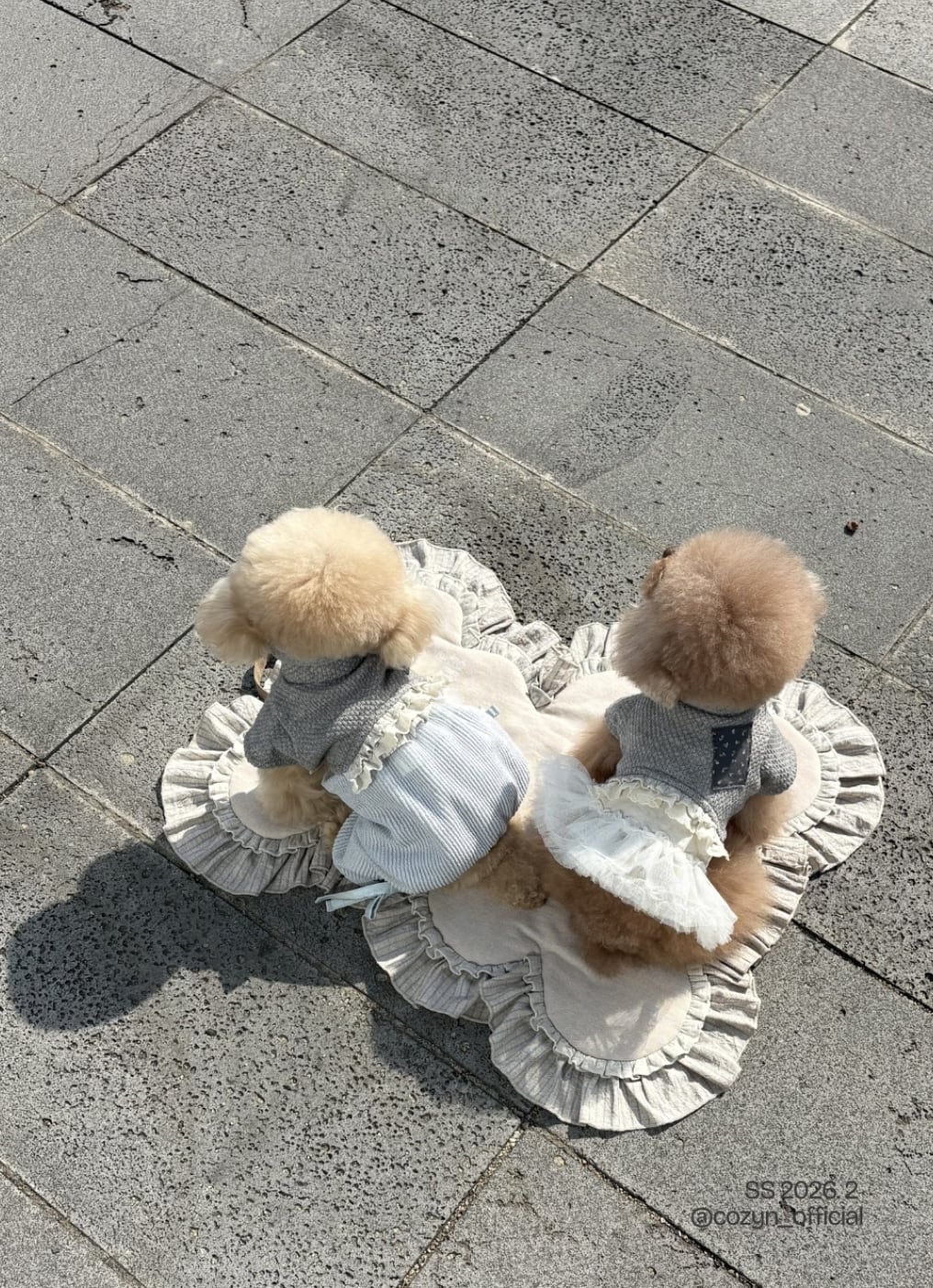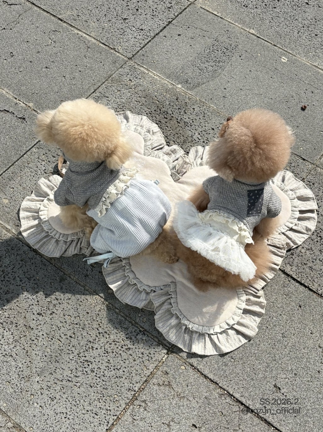 参考までに、モデル(左)マルプーのアコンはクロップド丈でXSを、(右)アプリコットプードルのミミはジャストサイズでSを着用しました。