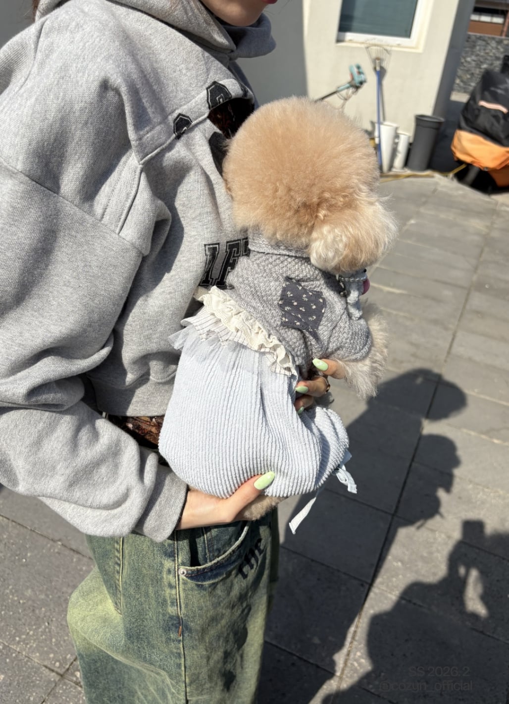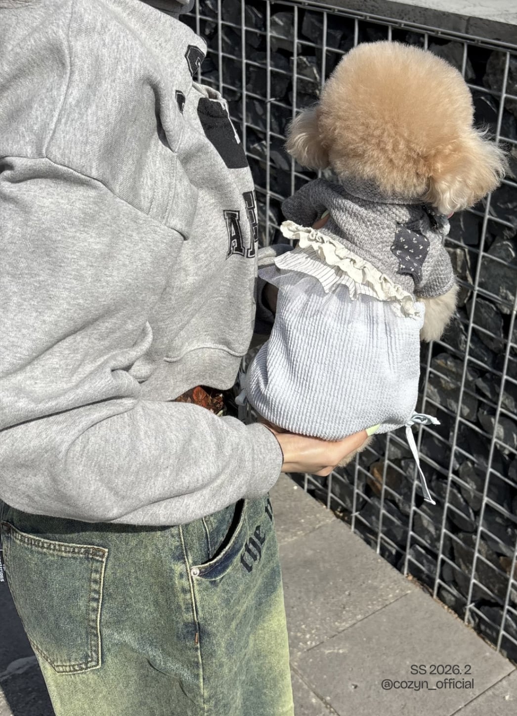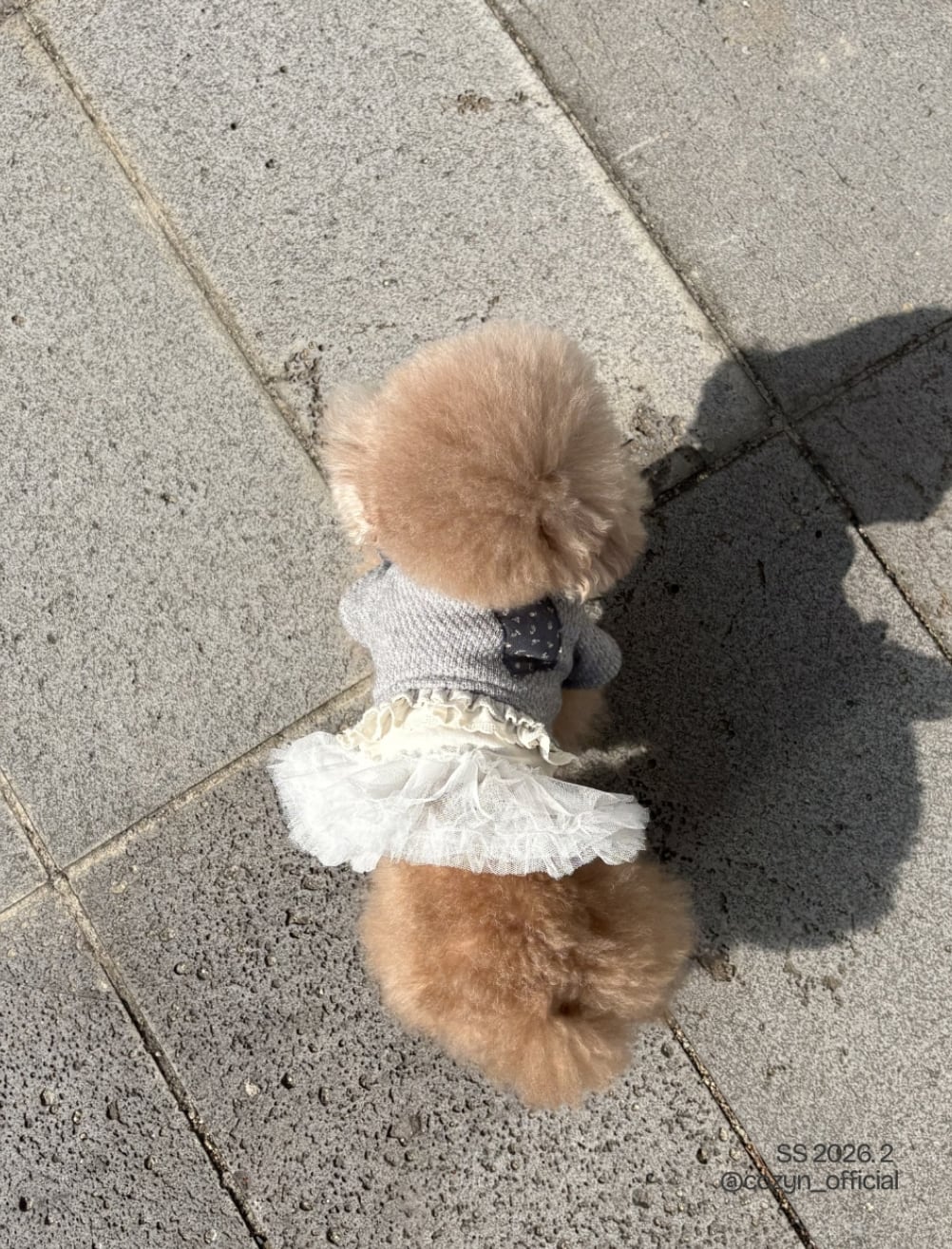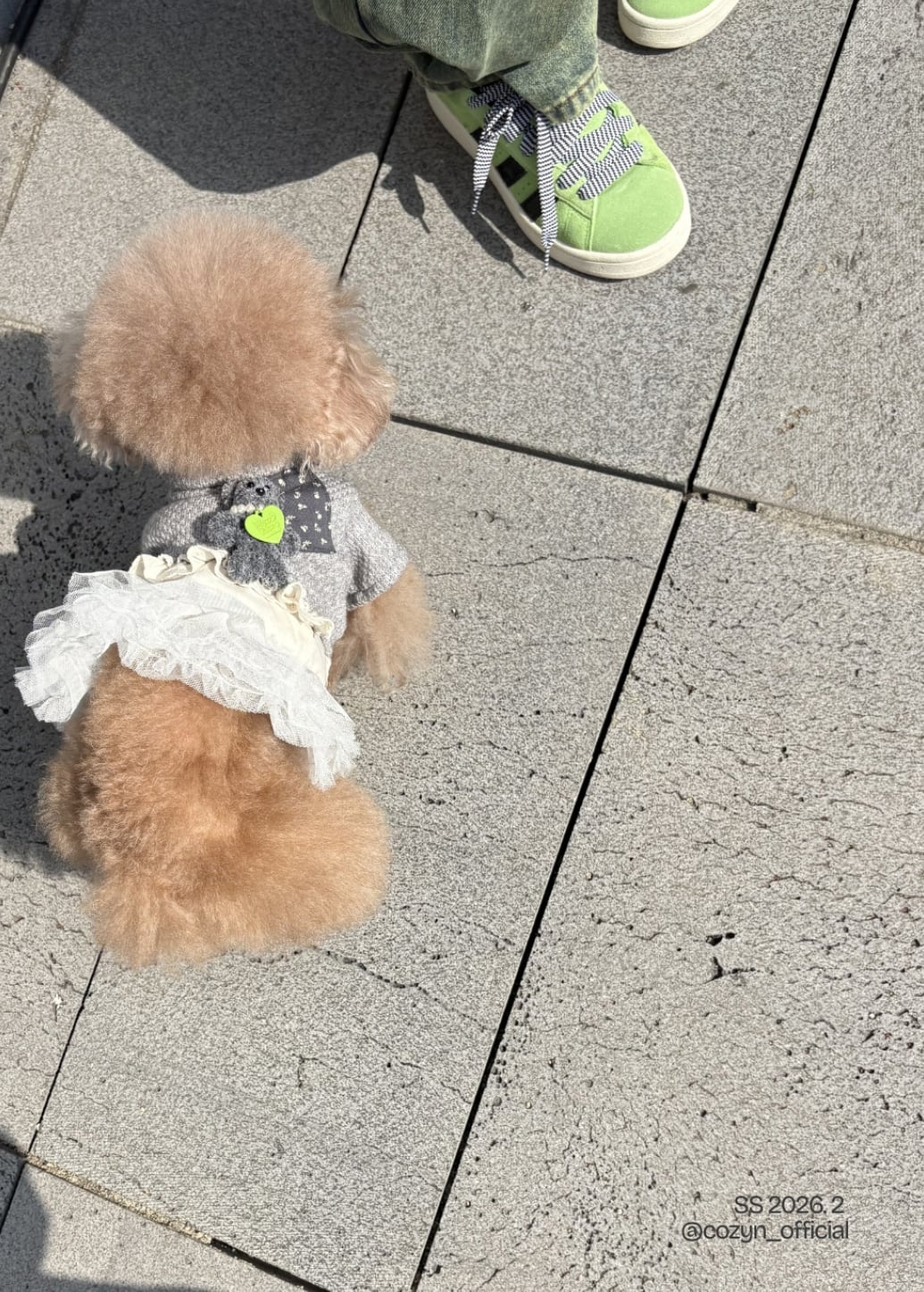 参考までに、モデル(左)マルプーのアコンはクロップド丈でXSを、(右)アプリコットプードルのミミはジャストサイズでSを着用しました。