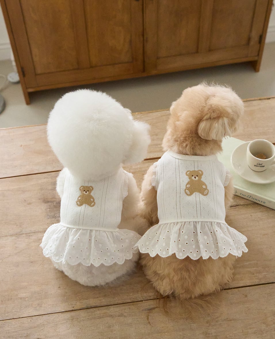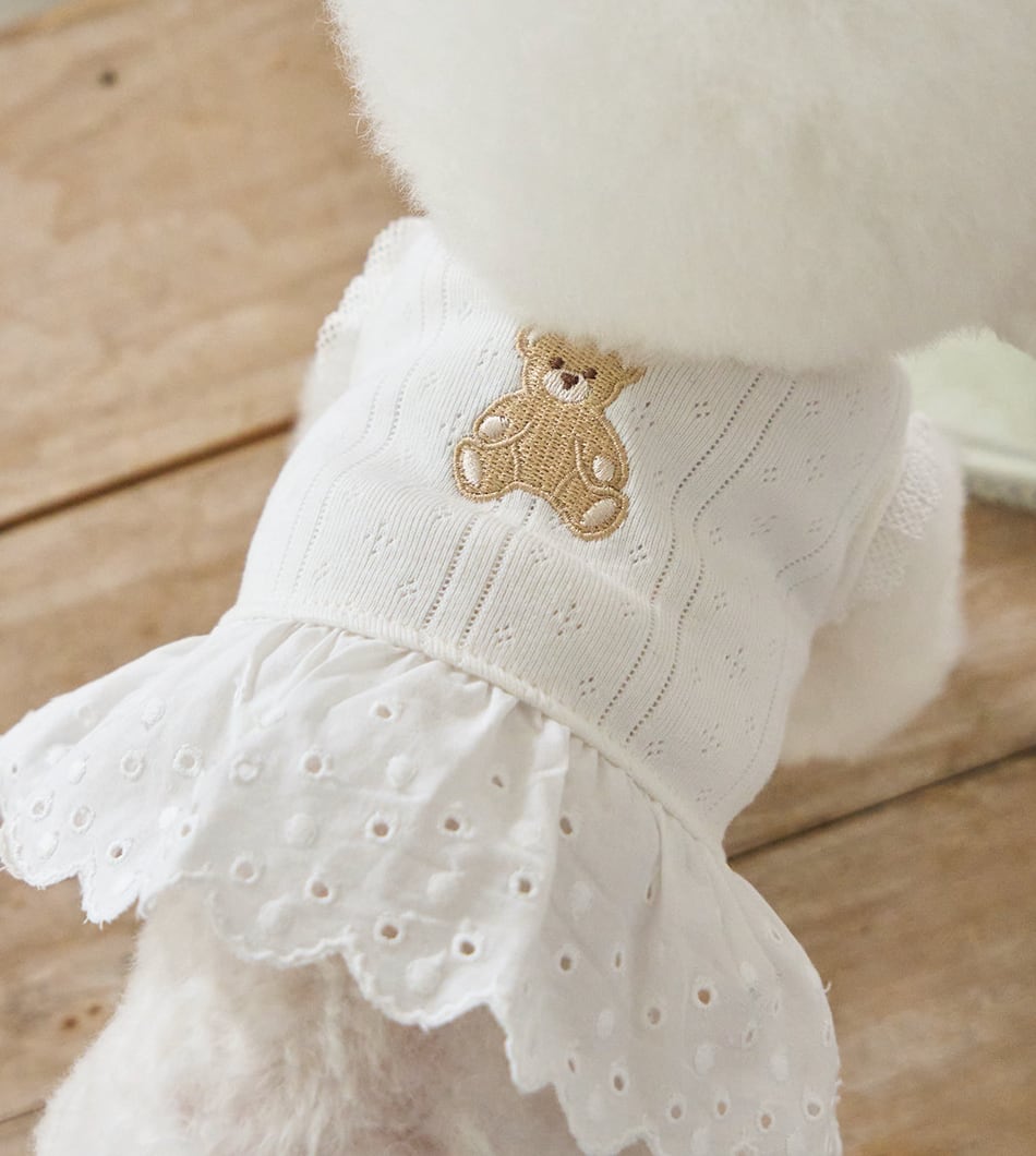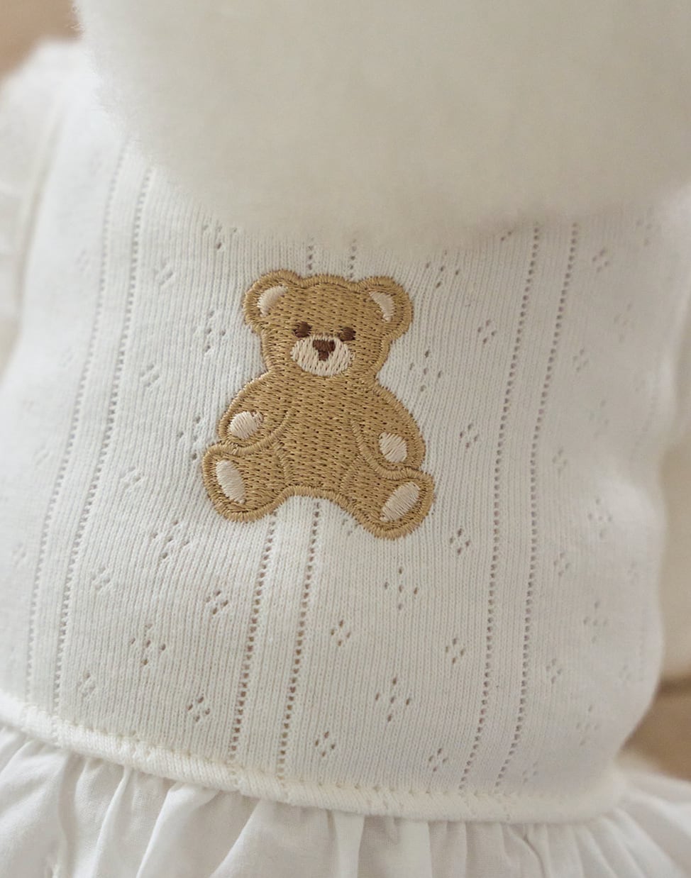 シンプルなテクスチャーに施されたテディ刺繍が、