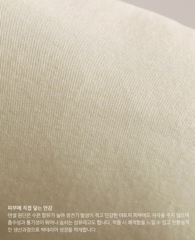 ※テンセル素材は水分含有量が高く、静電気が起きにくいため、敏感肌やアトピー肌にも優しい素材です。吸湿性・通気性にも優れており、“呼吸する繊維”とも呼ばれています。快適な着用感に加え、環境に配慮した製造工程でバクテリアの繁殖も抑制します。