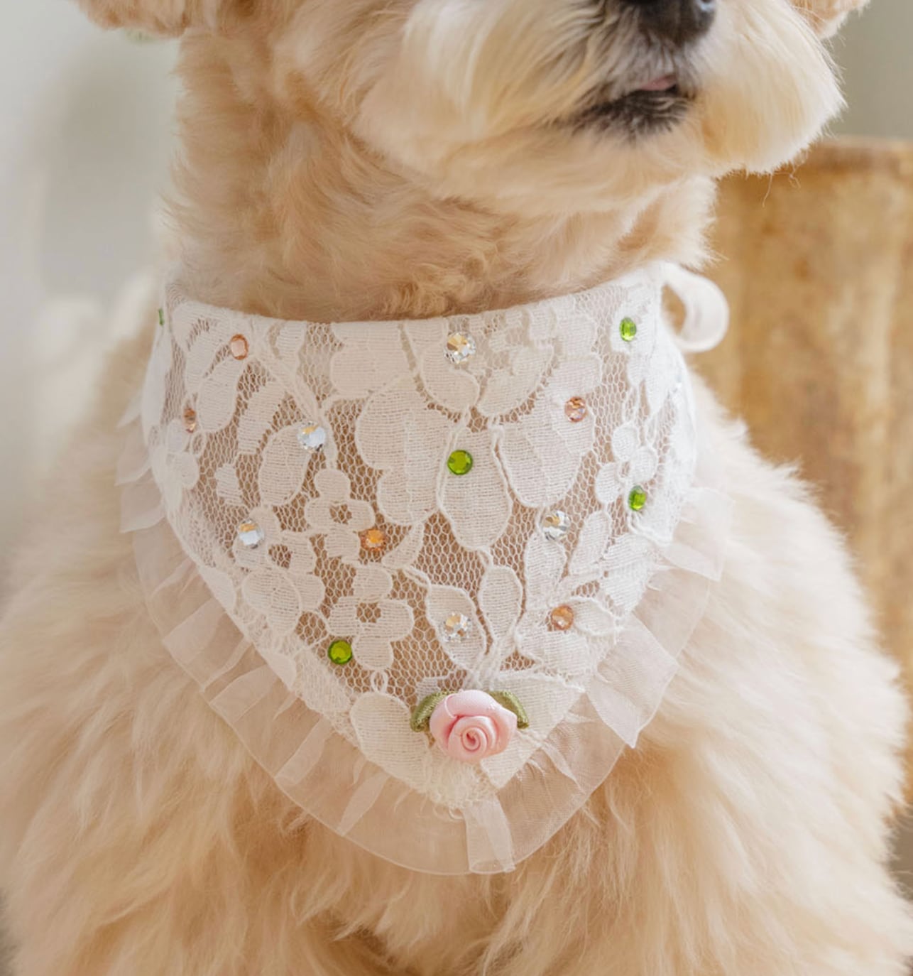 オーガンジーフリルとローズディテールが加わり、より愛らしい印象に仕上がっています。
