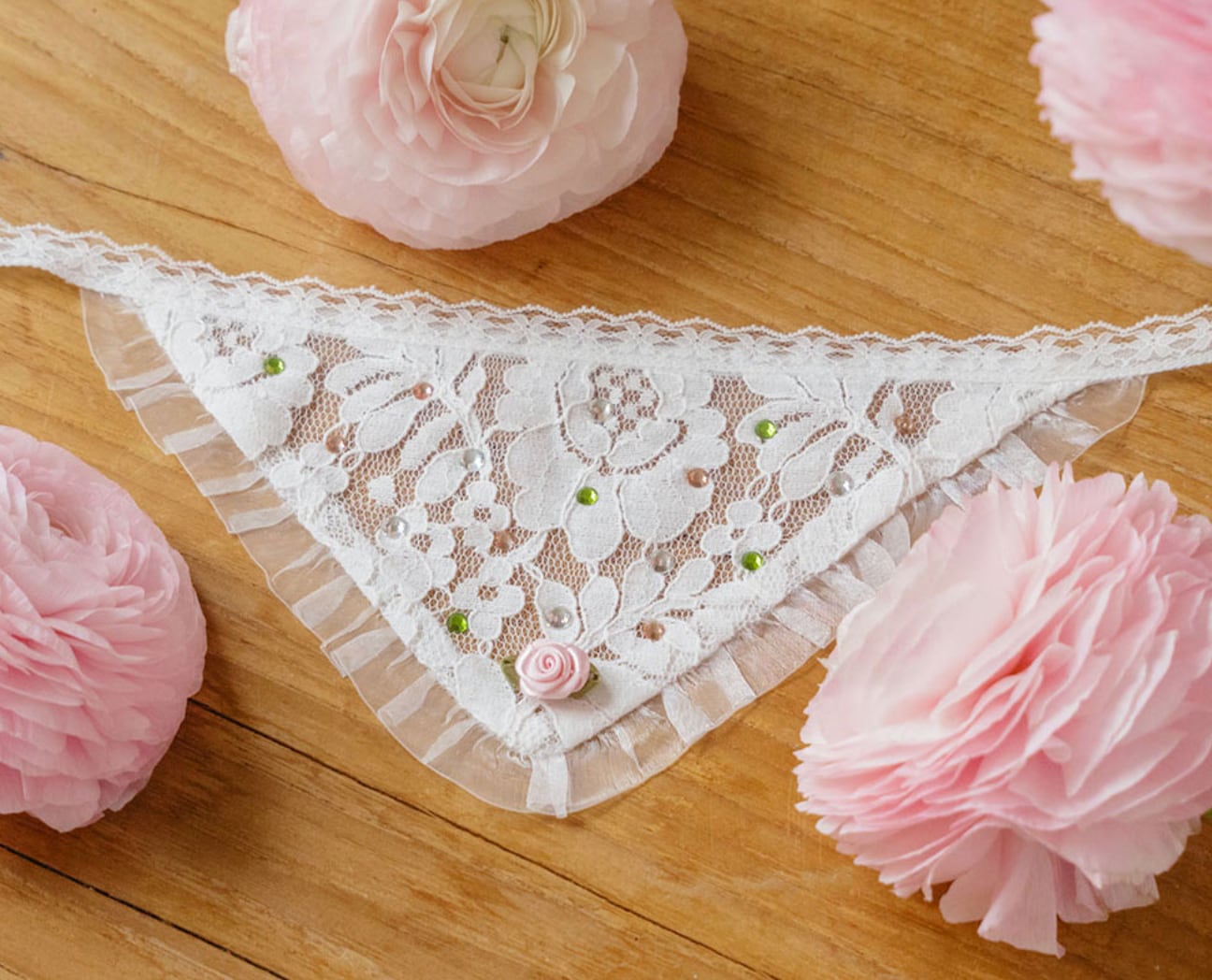 ピュアなホワイトのシースルーレースに散りばめられたホットフィックスが、動くたびに宝石のように輝くバンダナ。
