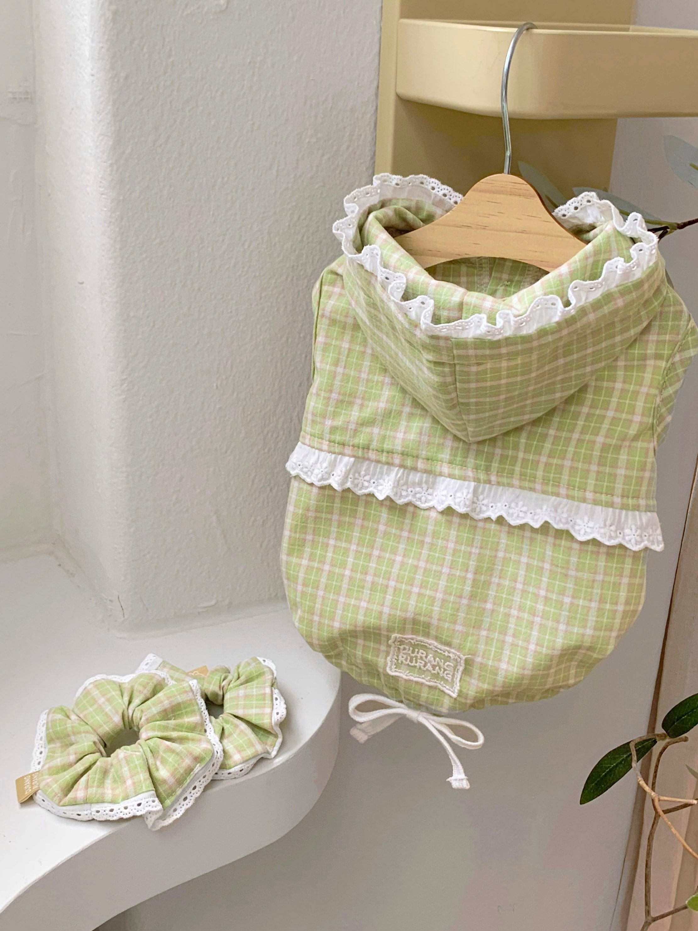 コーディネートされているチェックシュシュと合わせると、可愛さがさらにアップします。