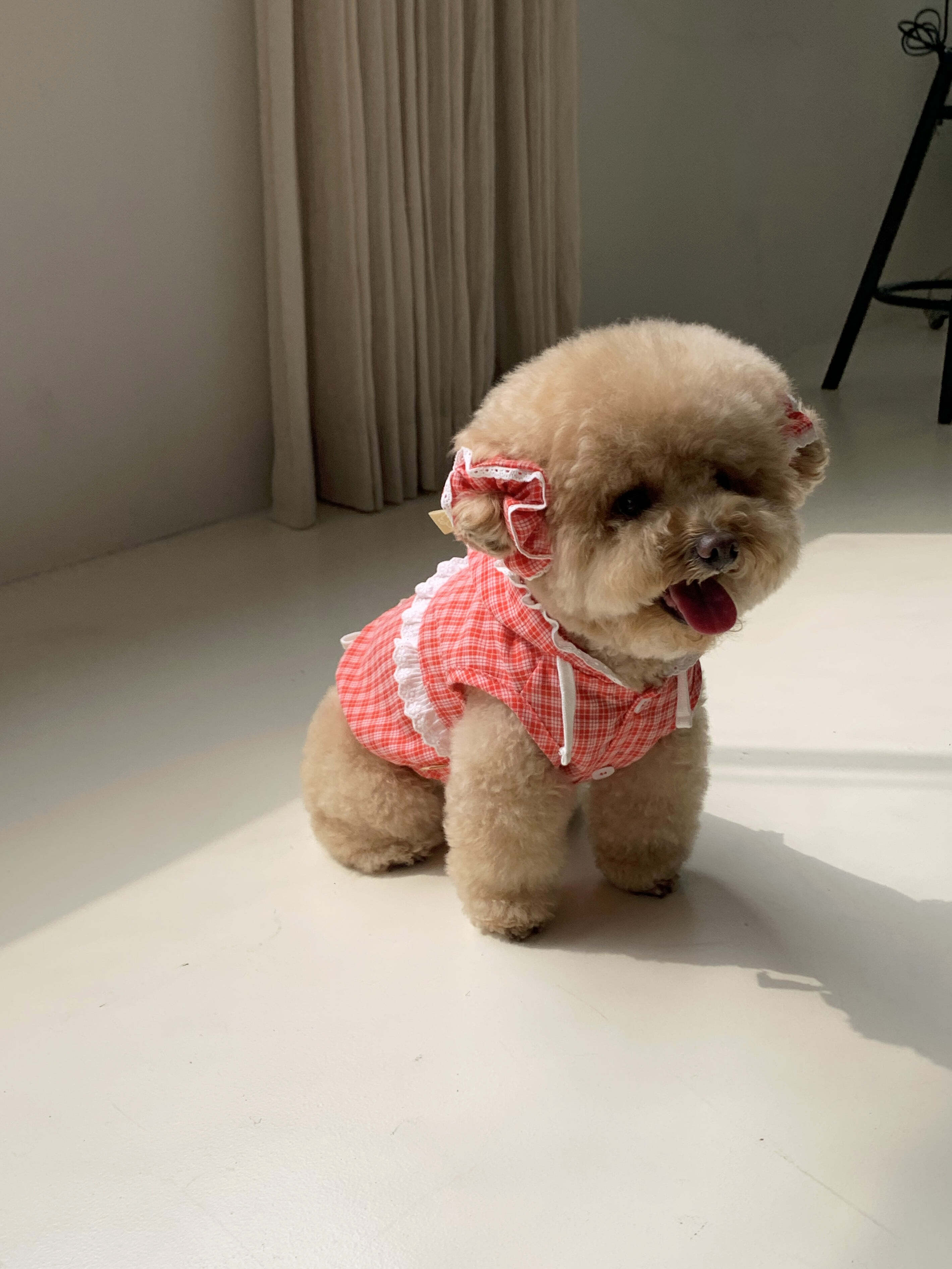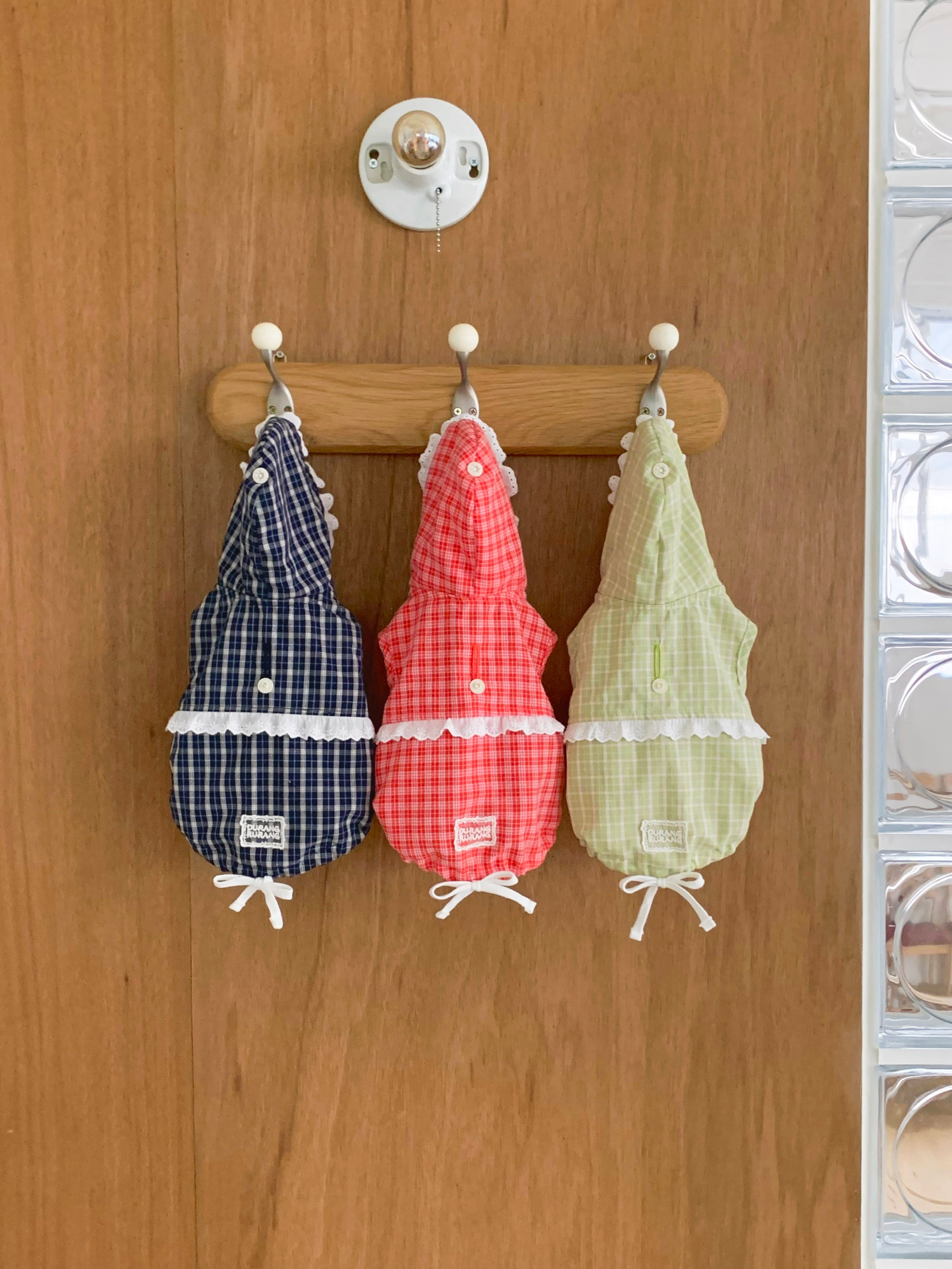 コーディネートされているチェックシュシュと合わせると、可愛さがさらにアップします。
