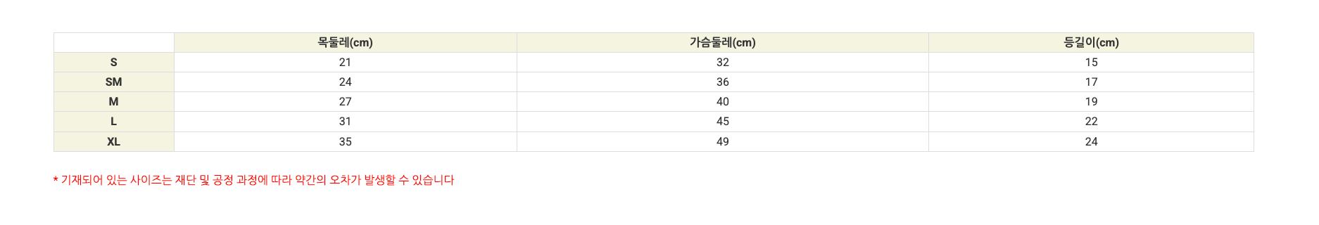 SM:首回り 24 / 胸囲 36 / 着丈 17