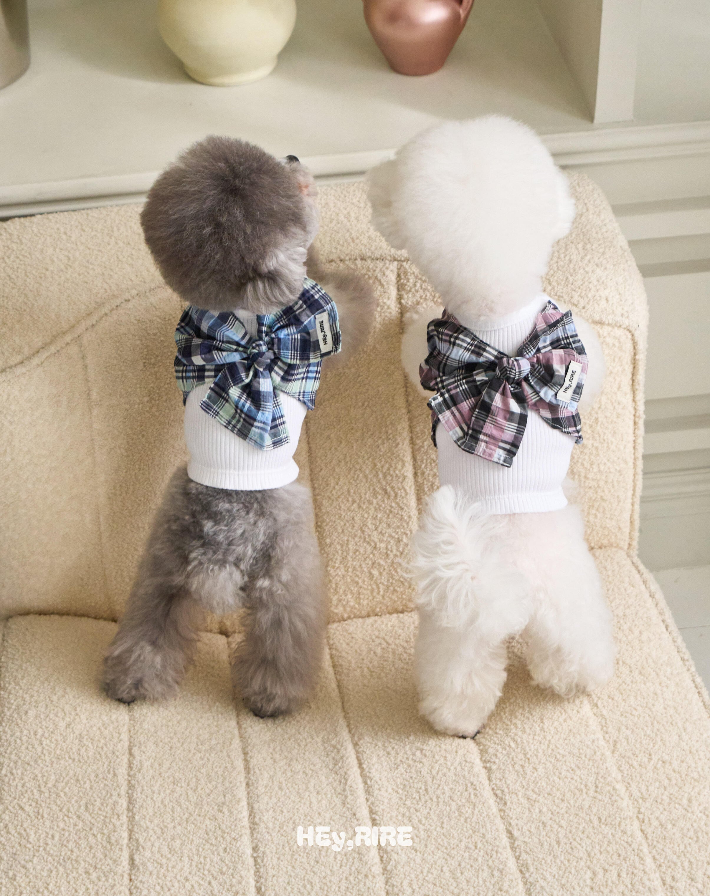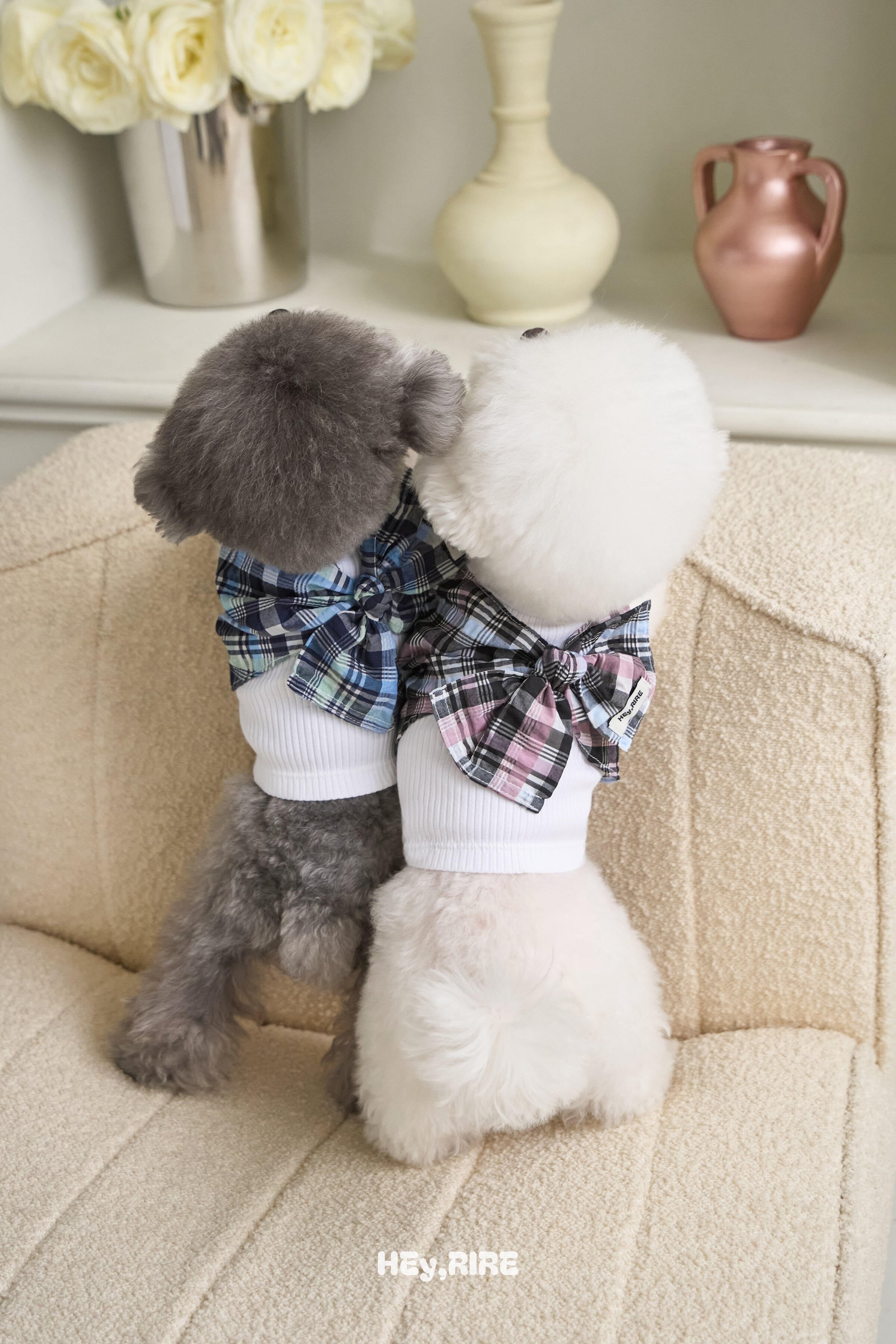 手で一度結んで斜めに取り付けたチェックリボンと、
