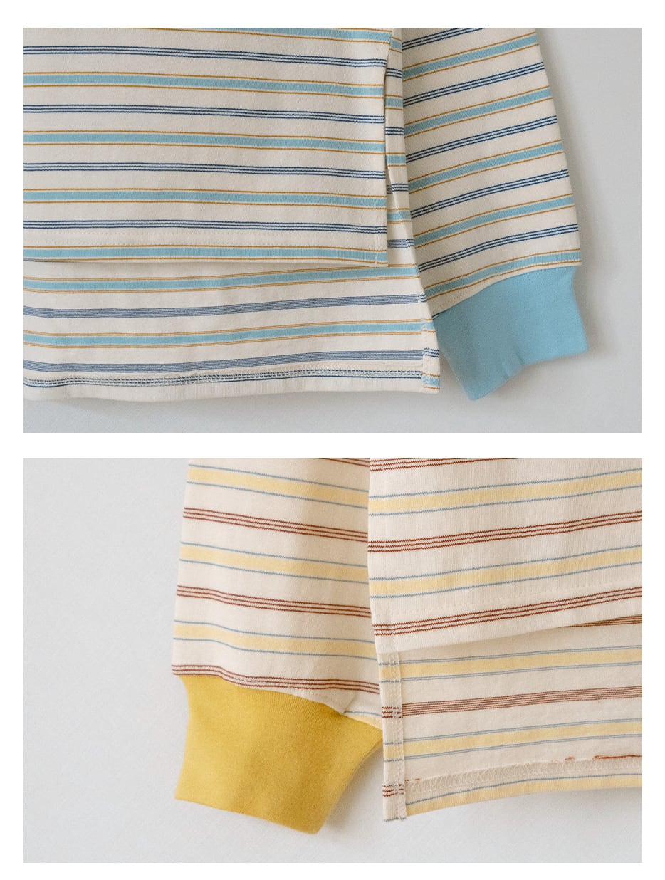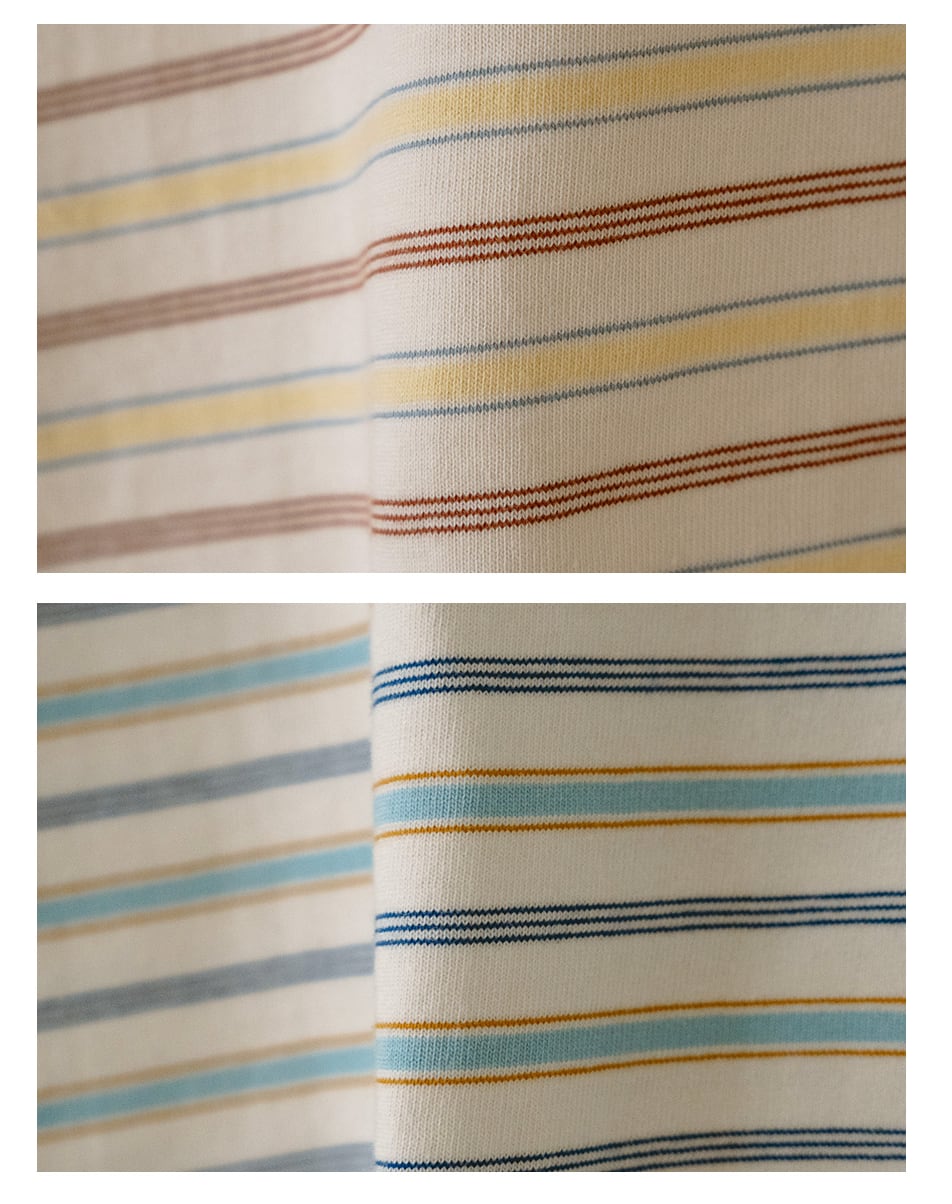 明るく爽やかなストライプパターンに、ネックラインと袖口に配色ポイントを加え、よりカジュアルで軽やかな雰囲気に仕上げました。