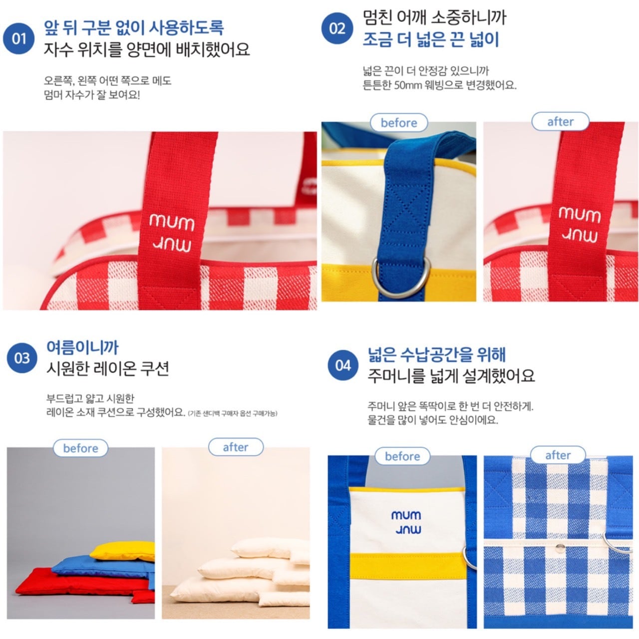 ・持ち手の刺繍を両面に配置することで表裏関係なく使えるようにしました。