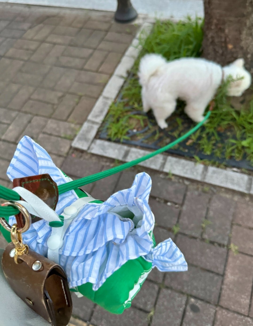 数回の試行錯誤の末、スナップボタンを付けてお散歩バッグやリードにぶら下げる事ができるようにしました。