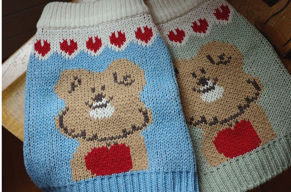 温かい愛情を胸に抱くような、ふわふわしたクマの編み込みがとても可愛いセーターです。